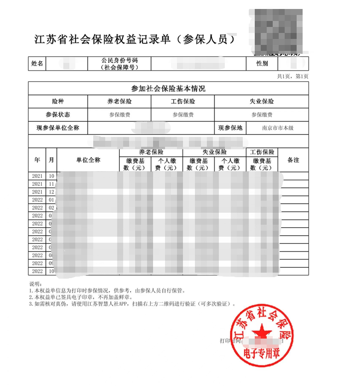 (“江苏智慧人社”APP——个人权益单——江苏省社会保险权益记录单(参保人员))